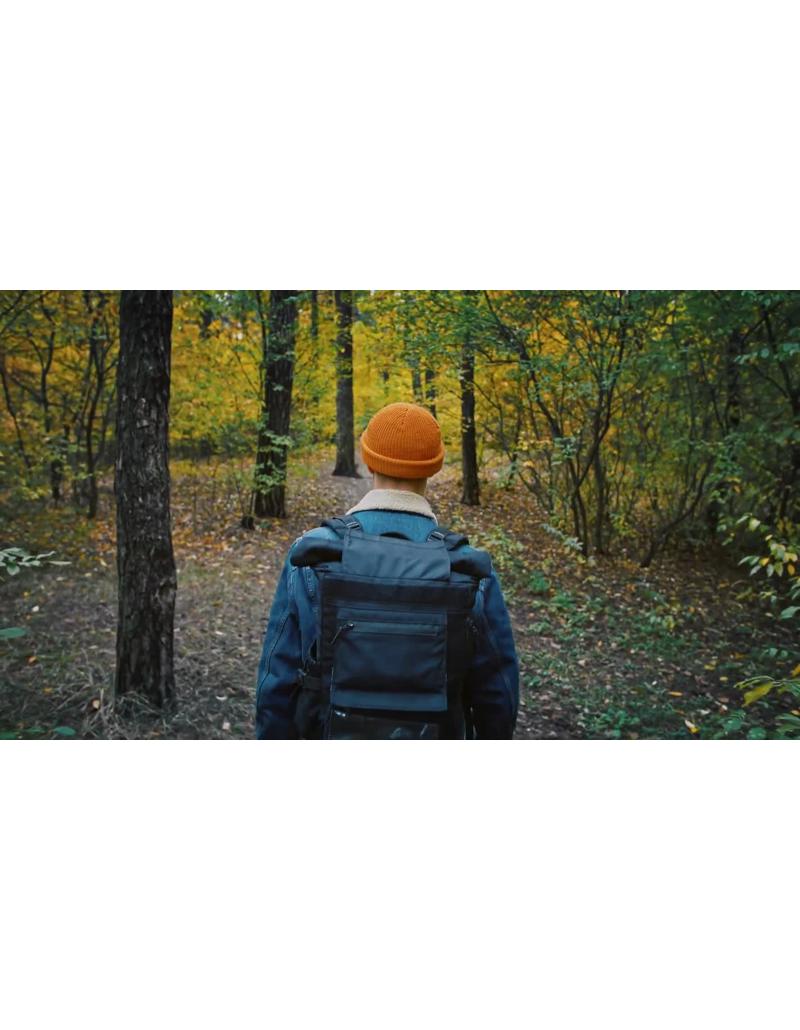 نمای سینمایی از قدمزدن مرد جوان در جنگل رنگارنگ پاییزی. مناسب برای گردشگری، طبیعت و ویدیوهای الهامبخش.